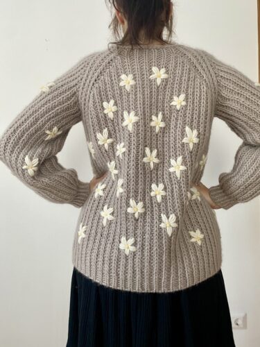 Embroidering flowers on your knitted pieces is a wonderful way to add personality and a touch of whimsy to your garments. For my Fluffy Daisy Cardigan, I chose classic straight stitch daisies and scattered them across the fabric for a soft, garden-inspired look. This simple technique allows the flowers to blend beautifully with the brioche stitch, creating a playful effect that feels both elegant and cozy.