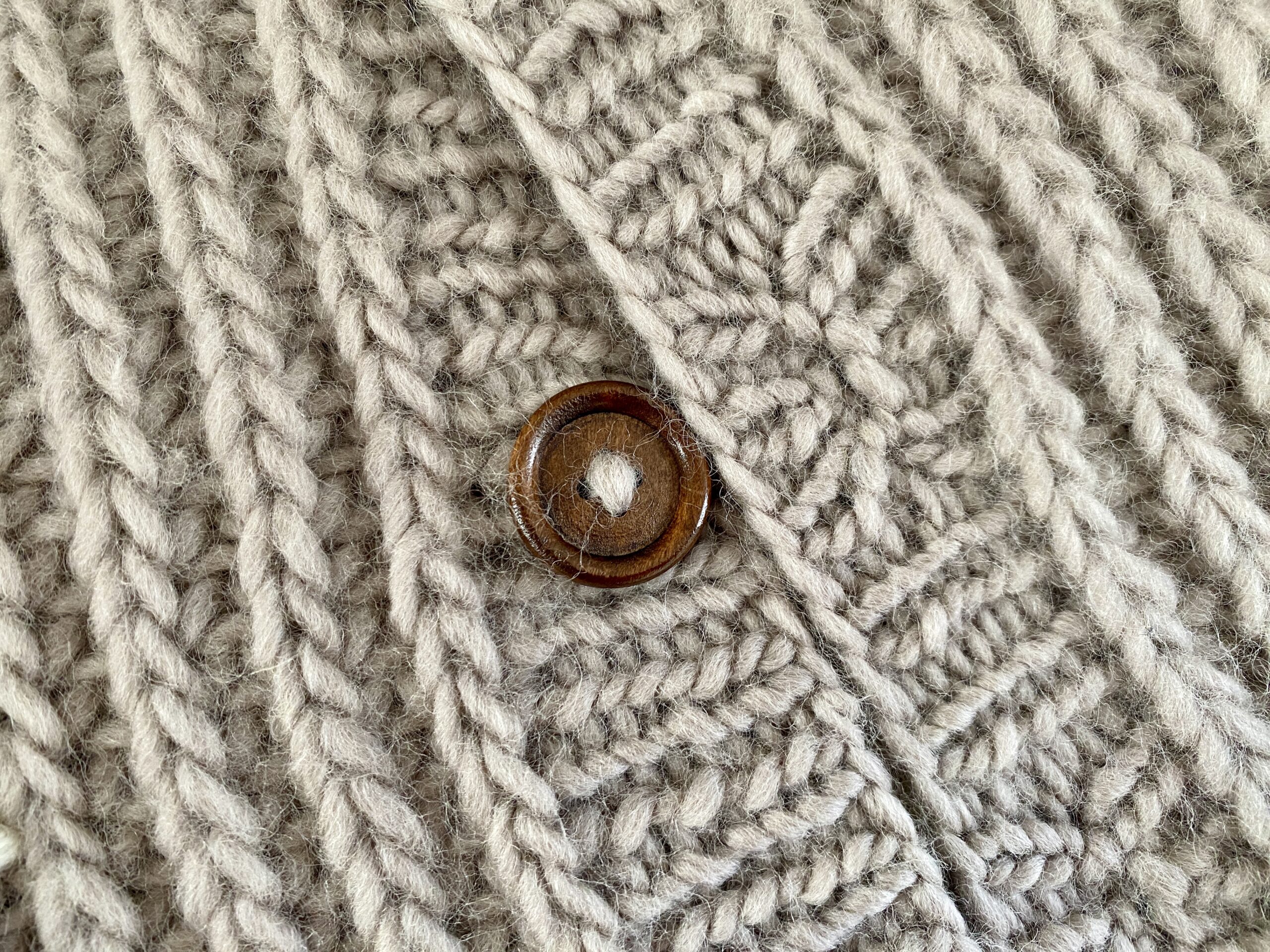 - Buttonband: I knitted 7 rows in a ribbing pattern for the buttonband. Since I used 2.5 mm buttons, I needed a wider buttonband. I created a one-row horizontal buttonhole by binding off 3 stitches.