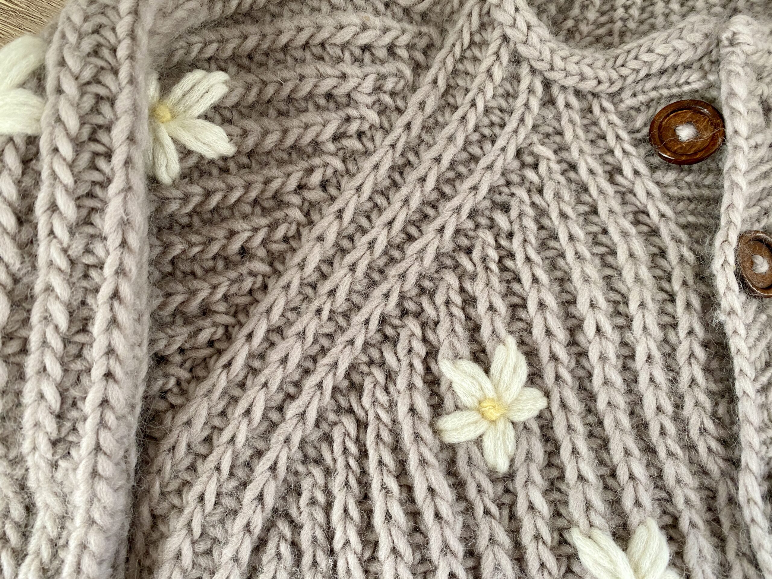 As I worked through the pattern, I was continually impressed by how beautifully the half brioche stitch came together. I’m especially in love with those raglan increases! The soft yarn from We Are Knitters - The Petite Wool was a dream to work with, and it draped perfectly as the cardigan began to take shape! The only downside of this wool was that wet blocking stretched it so much that it was a small workout to get it back in shape. Because of the large needles, the cardigan was knitted very quickly. I finished it with an Italian bind-off to give it a polished look. What took the longest was the flower embroidery; I wanted mine to be small and scattered over the entire cardigan.