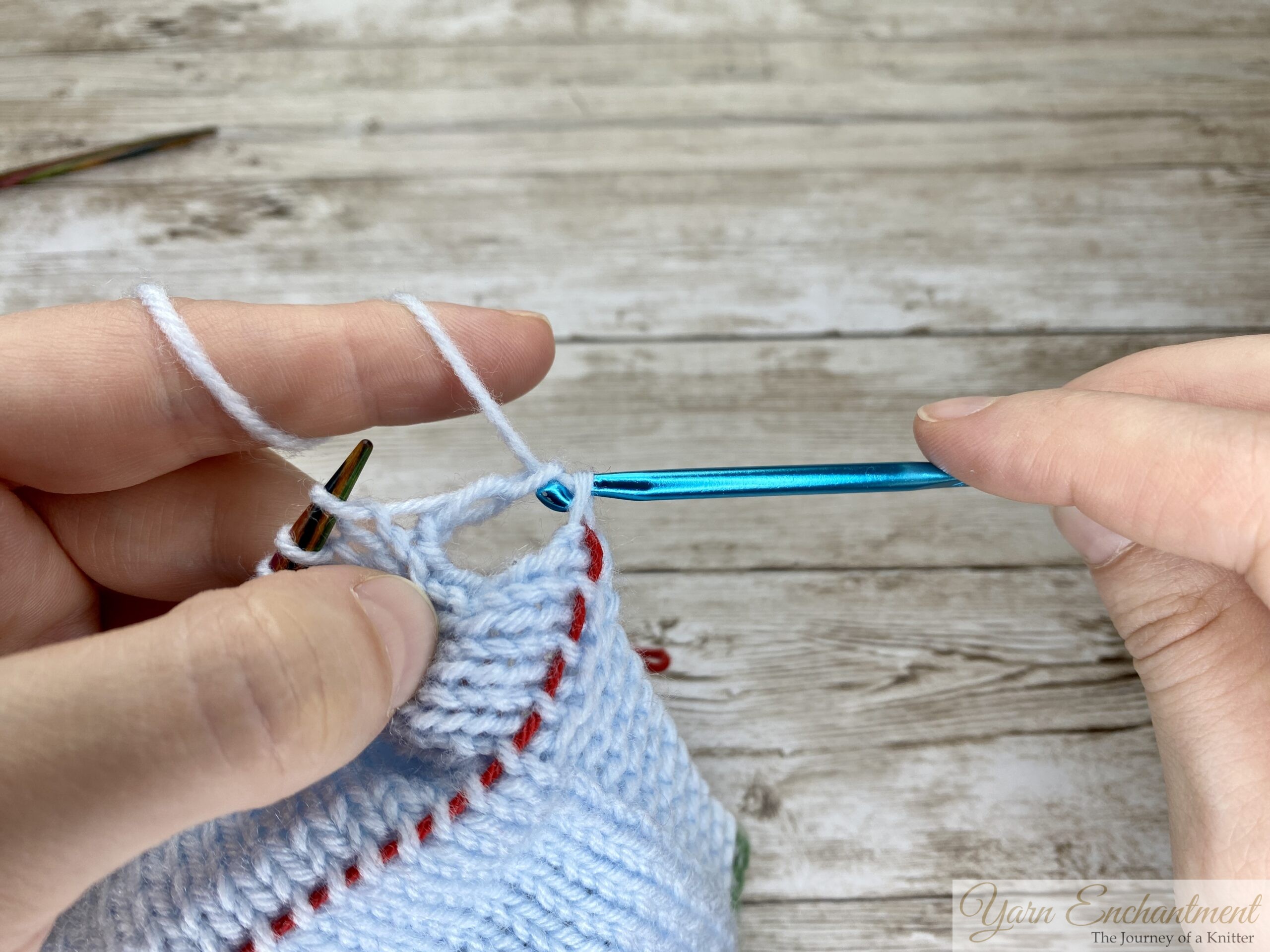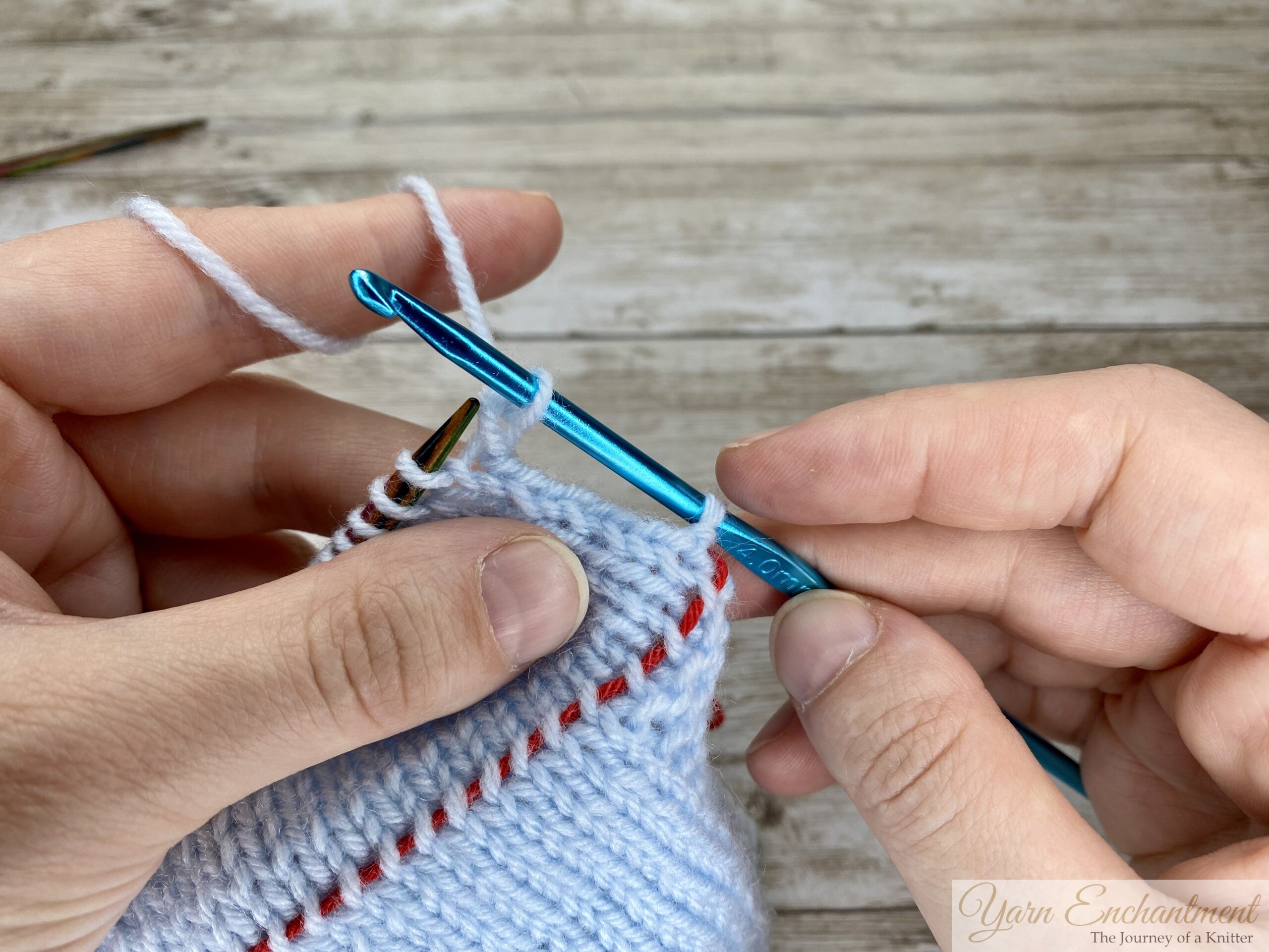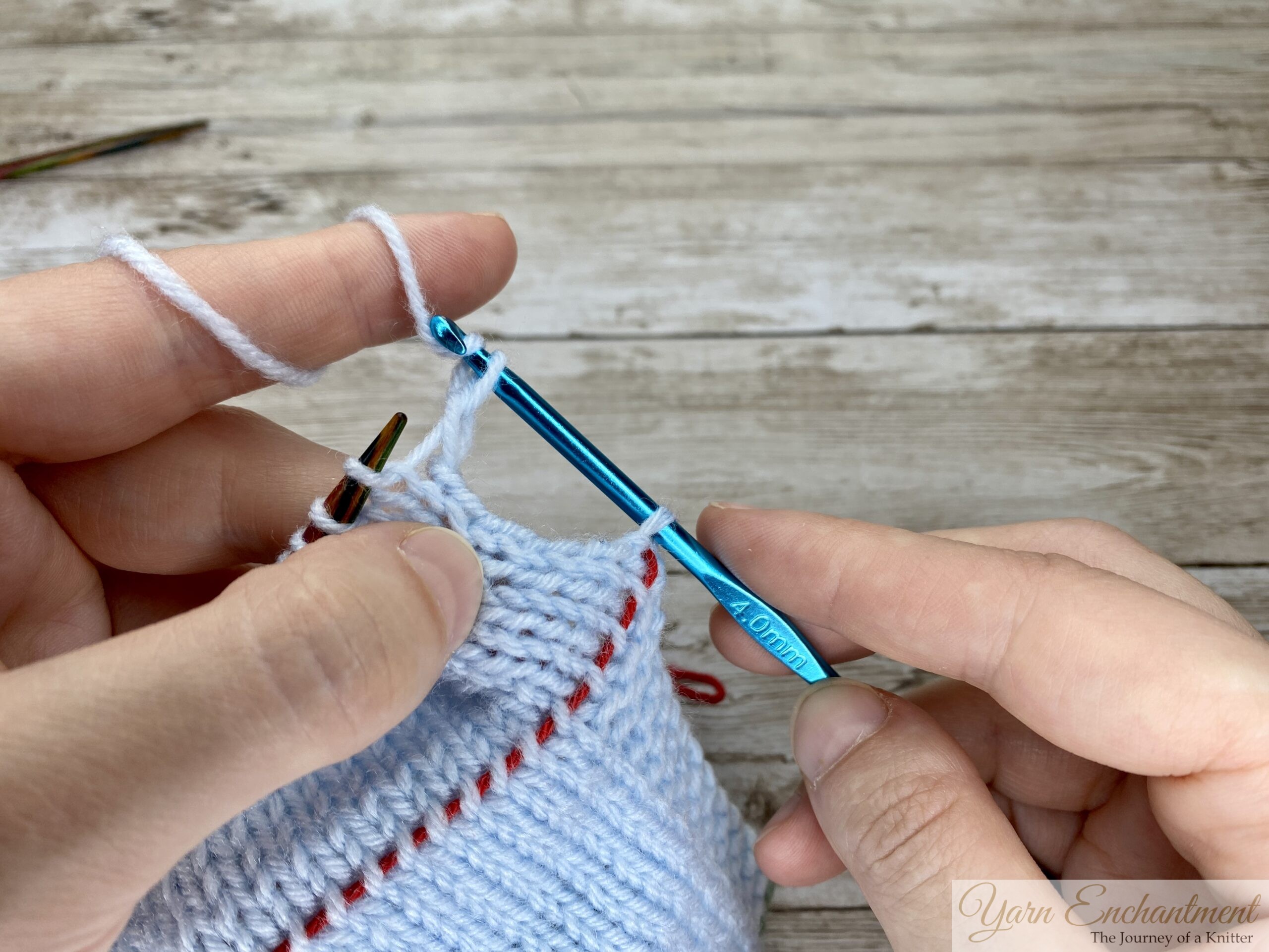 Thread a lifeline into the row where you want to start your folded edge. Then, knit the number of rows needed for your double-folded edge. For example, if you want your double-folded edge to be 5 cm, you need to knit 10 cm. When folded in half, it will measure 5 cm. - Insert the Crochet Hook: