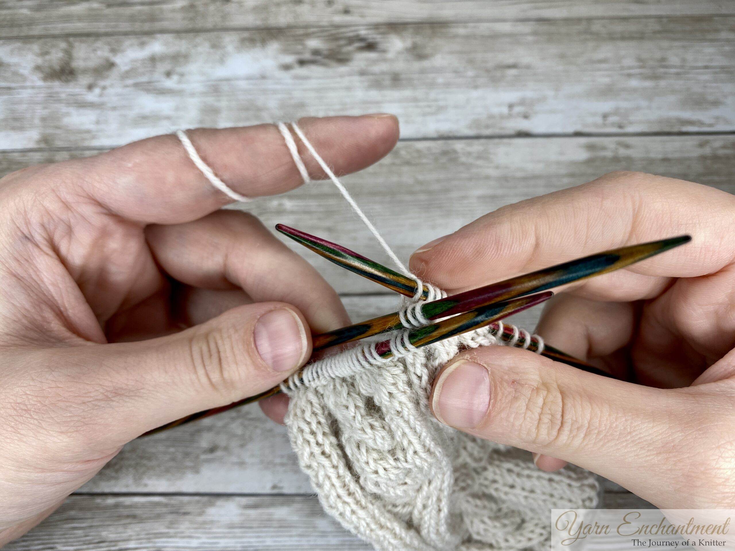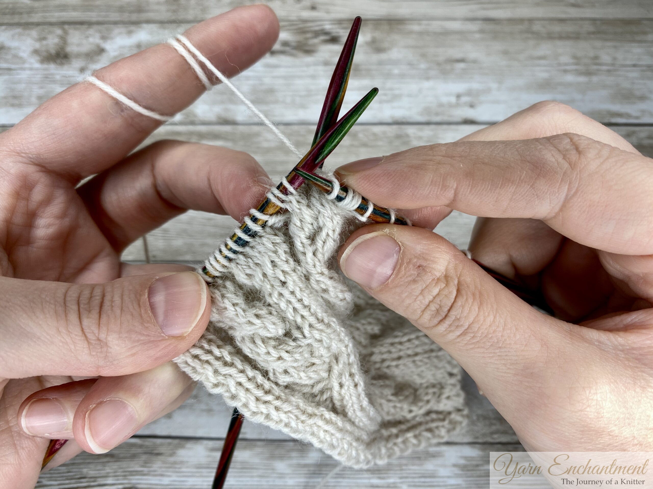 Knit the 3 stitches from the second cable needle | Knit the 4 stitches from the first cable needle | After row 15, the cables are now in the middle |