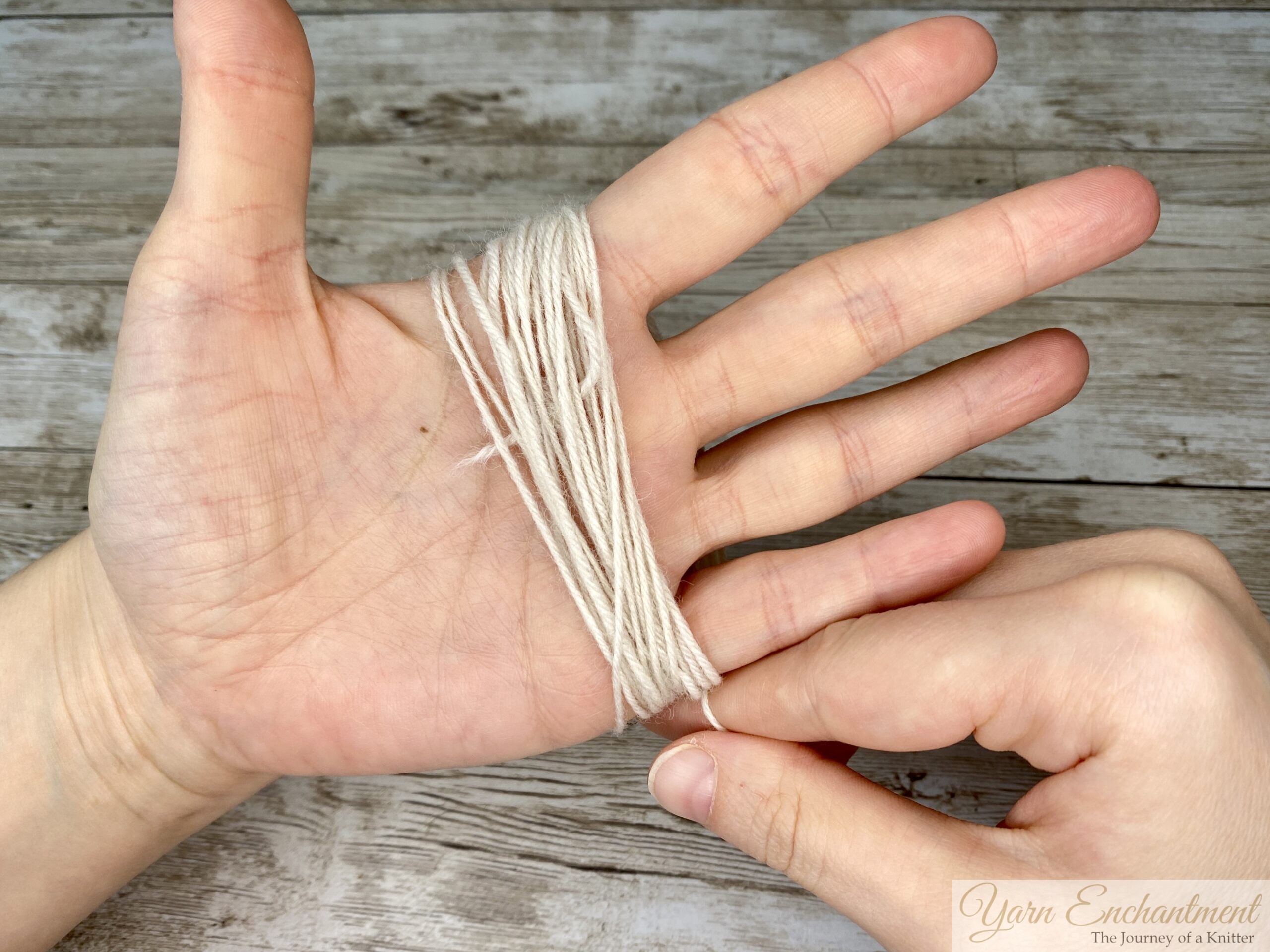- Pass the long tail of the yarn through the center of the tassel (the looped yarn you wrapped around your hand).