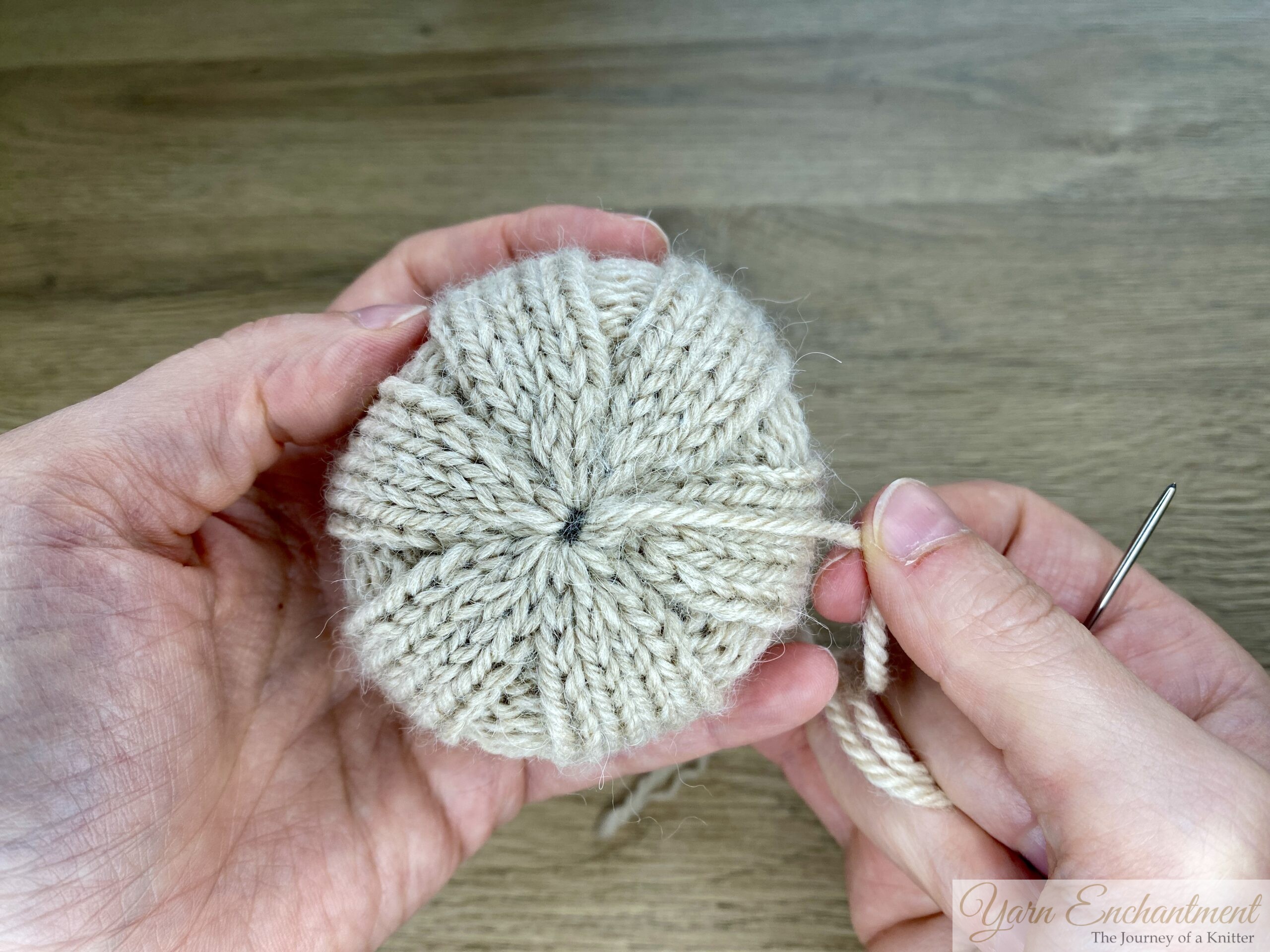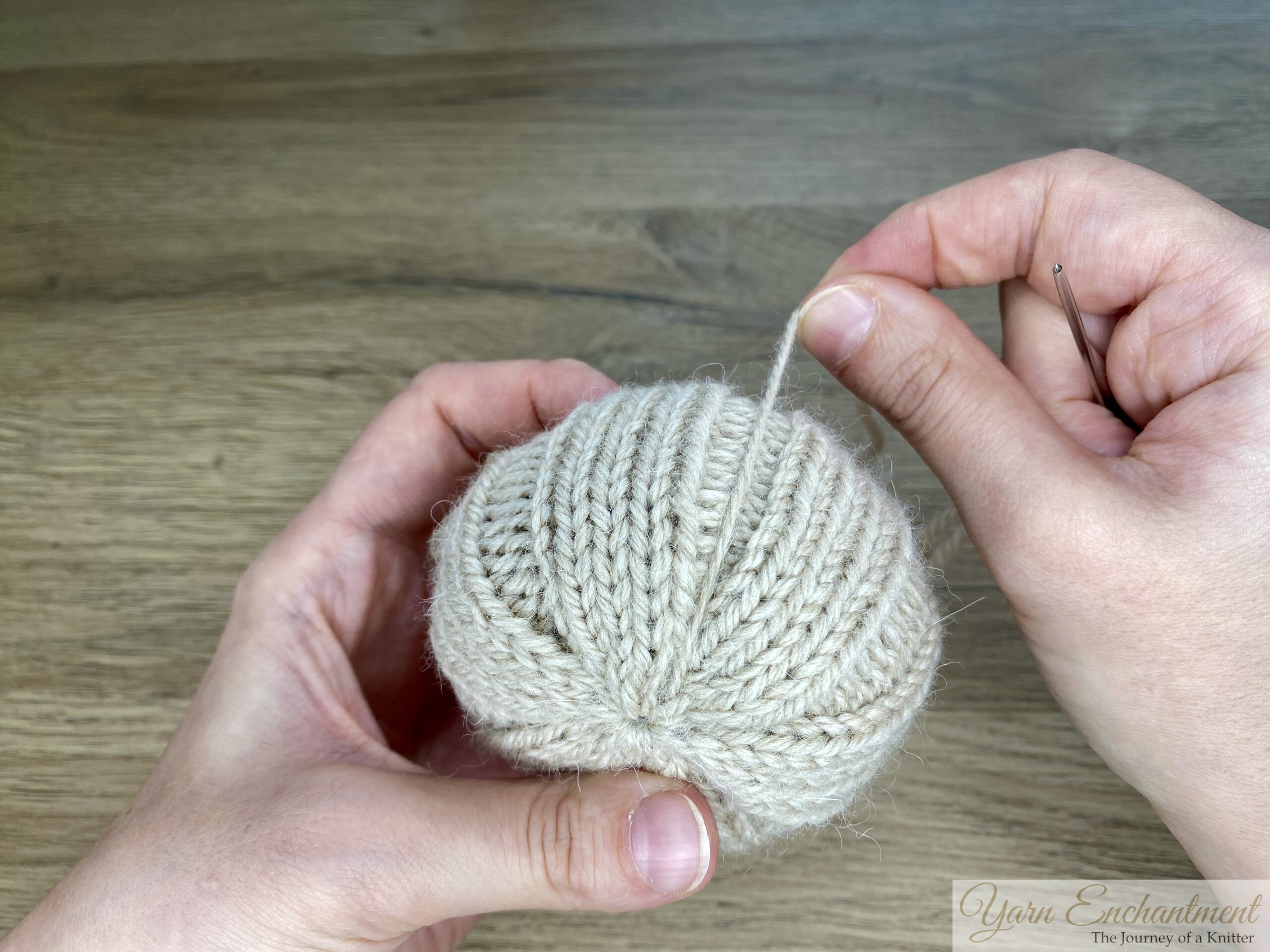 To shape your knitted pumpkin, use the long yarn tail and a blunt needle. Bring the yarn down along the purl columns, inserting the needle through the center of the pumpkin’s bottom, then passing it up through the center top. Pull the yarn tightly to squash the pumpkin into a round, squat shape. For a more realistic look, repeat this process, bringing the yarn over the side ridges (following the purl columns) and pulling snug to form distinct pumpkin segments. After shaping, secure the yarn and adjust the stuffing as needed for a smooth, rounded finish.