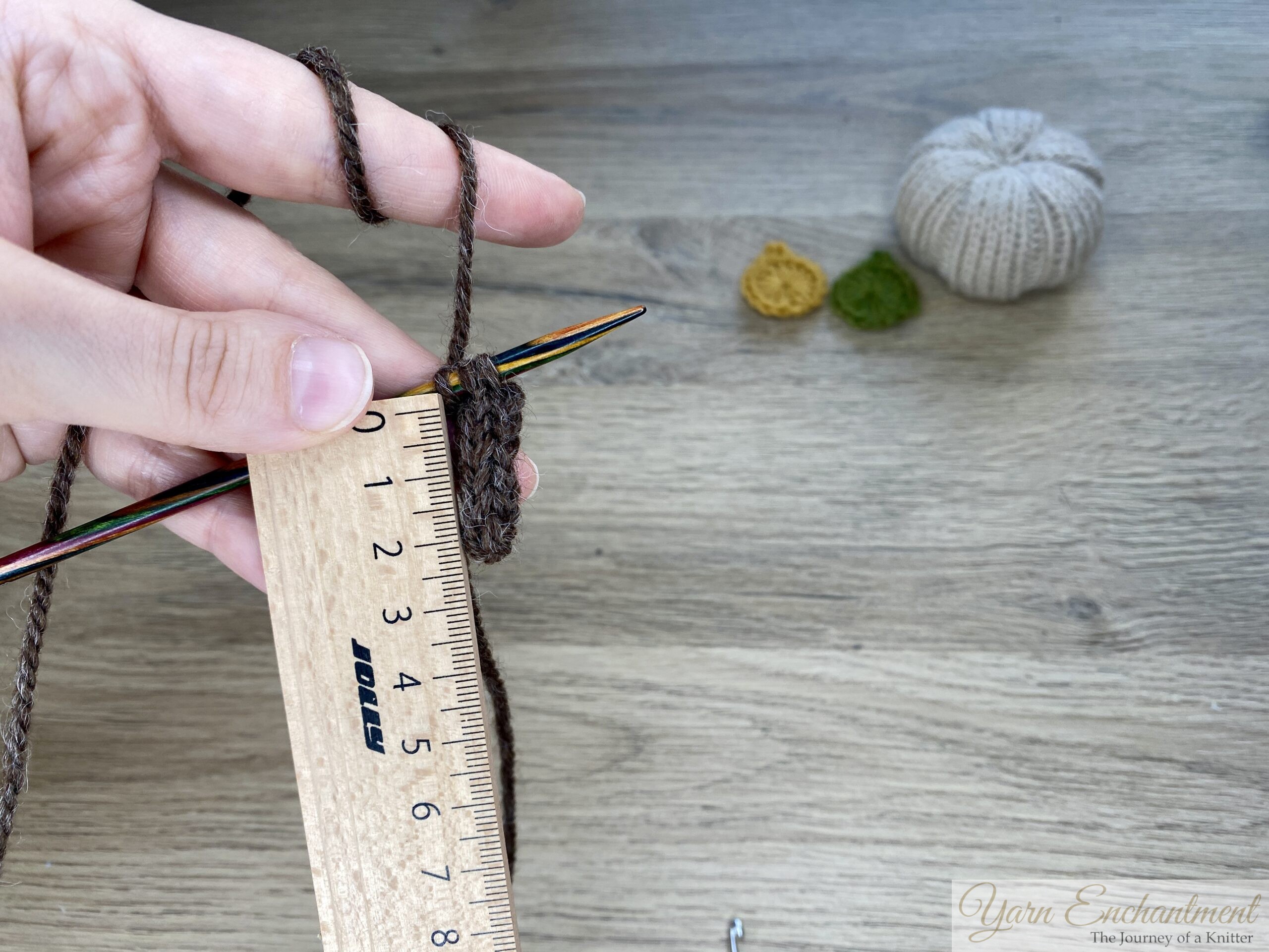 Repeat these steps until the tube measures about 2 cm (or your preferred length) | Slide the stitches to the right end of the needle and bind off all of them. | Weave in all your yarn ends and cut the yarn. Since the stem will be glued to the pumpkin, there’s no need to keep a yarn tail, but if you prefer, you can also attach the stem by sewing it on. |